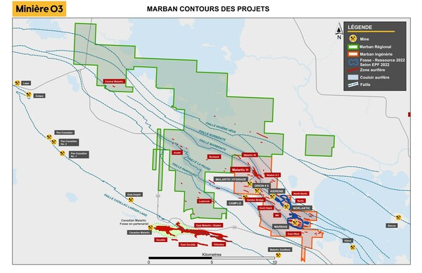 M. José Vizquerra, président et chef de la direction de Minière O3, a déclaré, « Les résultats positifs de cette première ERM sur Malartic H constituent une étape excitante pour Minière O3, car ils démontrent le potentiel de croissance du gîte Malartic H, tant sur le plan latéral qu'en profondeur. Nous sommes enthousiasmés par les résultats de notre campagne de forage hivernale et nous gardons l'espoir que des forages intercalaires supplémentaires nous permettront d'accroître le gisement et de démontrer la robustesse du projet Marban. »