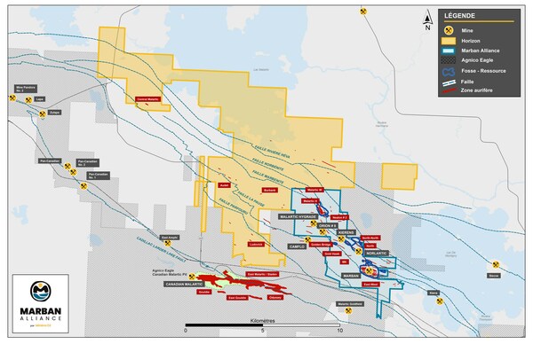 Le présent communiqué de presse contient des « informations prospectives » au sens attribué à ce terme par les lois canadiennes applicables sur les valeurs mobilières, qui sont basées sur les attentes, les estimations, les projections et les interprétations en date du présent communiqué de presse. Dans ce communiqué de presse, ces informations prospectives comprennent, sans s'y limiter, les déclarations suivantes : la production annuelle prévue pour le projet Marban Alliance ; la durée de vie de la mine pour le projet Marban Alliance ; l'autorisation sociale d'exploitation de la société ; le calendrier et la capacité de la société à réaliser une étude de faisabilité pour le projet Marban Alliance, le cas échéant ; le calendrier et les résultats des études d'optimisation de la société ; et les travaux prévus, y compris les collectes de données sur le terrain. Tout énoncé qui implique des discussions à l’égard de prévisions, d’attentes, d’interprétations, d’opinions, de plans, de projections, d’objectifs, d’hypothèses, d’évènements ou de rendements futurs (utilisant souvent, mais pas forcément, des expressions comme « s’attend » ou « ne s’attend pas », « est prévu », « interprété », « de l’avis de la direction », « anticipe » ou « n’anticipe pas », « planifie », « budget », « échéancier », « prévisions », « estime », « est d’avis », « a l’intention », ou des variations de ces expressions ou des énoncés indiquant que certaines actions, certains évènements ou certains résultats « pourraient » ou « devraient » se produire, « se produiront » ou « seront atteints ») n’est pas un énoncé de faits historiques et pourrait constituer de l’information prospective et a pour but d’identifier de l’information prospective. Sauf pour les énoncés de faits historiques relatifs à la Société, certaines informations contenues dans les présentes constituent des énoncés prospectifs. L’information prospective est basée sur les estimations de la direction de la Société et, au moment où elle a été formulée, implique des risques connus et inconnus, des incertitudes et d’autres facteurs qui pourraient faire en sorte que les résultats réels, les performances ou les réalisations de la Société soient sensiblement différents des résultats, des performances ou des réalisations futurs explicitement ou implicitement indiqués par cette information prospective. Ces facteurs comprennent notamment les risques liés aux résultats de forage à Malartic H; l’importance des résultats de forage; la capacité des résultats de forage de prédire la minéralisation avec exactitude; la capacité de la Société de produire une mise à jour de l’estimation des ressources minérales à Malartic au T2 2023 (ou à tout autre moment); la capacité de tout matériel d’être extrait de manière rentable. Bien que l’information prospective contenue dans le présent communiqué soit basée sur des hypothèses considérées raisonnables de l’avis de la direction au moment de leur publication, les parties ne peuvent garantir aux actionnaires et aux acheteurs éventuels de titres que les résultats réels seront conformes à l’information prospective, puisqu’il pourrait y avoir d’autres facteurs qui auraient pour effet que les résultats ne soient pas tels qu’anticipés, estimés ou prévus, et ni la Société ni aucune autre personne n’assume la responsabilité pour la précision ou le caractère exhaustif de l’information prospective. La Société est d’avis que cette information prospective est basée sur des hypothèses raisonnables, mais rien ne garantit que ces attentes s’avéreront exactes et par conséquent, l’on ne devrait pas se fier indûment aux énoncés prospectifs compris dans le présent communiqué de presse. La Société n’entreprend et n’assume aucune obligation d’actualiser ou de réviser tout énoncé prospectif ou toute information prospective contenu dans les présentes en vue de refléter de nouveaux évènements ou de nouvelles circonstances, sauf si requis par la loi. Ces énoncés ne sont valides qu’en date de ce communiqué de presse.