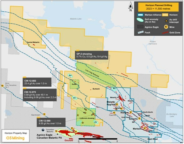 - Marban Régional, avec l’ajout de l’actif Héva, devient le projet Horizon, qui est à l’étape initiale d’exploration qui représente un regroupement de l'exploration régionale de la Société dans le secteur de Malartic-Rivière-Héva (voir les figures 1 et 2) Les travaux sur ces projets visent à déterminer s'il y a une minéralisation significative qui justifie des travaux supplémentaires.