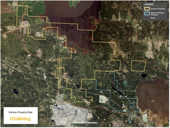 Le projet Horizon, nouvellement nommé englobe l’ensemble des actifs faisant précédemment partie de Marban Régional, la propriété Héva ainsi que certains claims récemment acquis indiqués sur la carte ci-dessous. Le projet Horizon demeure un actif d’exploration pour Minière O3 et continue de faire l’objet de travaux comme planifiés et annoncés (Voir Communiqué du 16 janvier 2023).