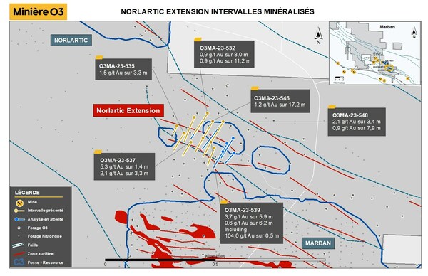 M. José Vizquerra, président et chef de la direction de Minière O3, a commenté : « Ces nouvelles intersections provenant de notre programme intercalaire de 2023 à Marban Alliance fourniront des données supplémentaires pour faire avancer les ressources existantes à Marban Alliance. Situés dans le gîte Norlartic Extension, ces résultats rehaussent notre confiance d'optimiser la ressource des fosses satellites à Norlartic Extension dans notre étude de faisabilité à venir. Nous continuerons de publier les résultats de notre campagne de forage intercalaire de 2 886 mètres au fur et à mesure que les résultats d'analyse seront reçus. »