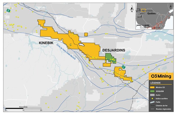 M. José Vizquerra, président et chef de la direction de Minière O3, a commenté : « Nous sommes heureux de consolider davantage notre présence le long du couloir Casa Berardi en procédant à l'acquisition de la propriété Desjardins de SOQUEM. La propriété Desjardins s'intègre bien aux terrains que nous détenons déjà dans le cadre du projet Kinebik et permettra à notre équipe de réaliser d'autres travaux de forage d'exploration à Casa Berardi au courant de l'hiver. Cela s'aligne bien avec notre stratégie d'exploration fondamentale et s'inscrit dans le prolongement de notre mission, qui consiste à explorer et à mettre en valeur les failles géologiques majeures au Québec. Notre succès en exploration le long de la Faille de Cadillac sert de tremplin d'expertise afin de poursuivre notre stratégie le long du prolifique couloir de Casa Berardi ».